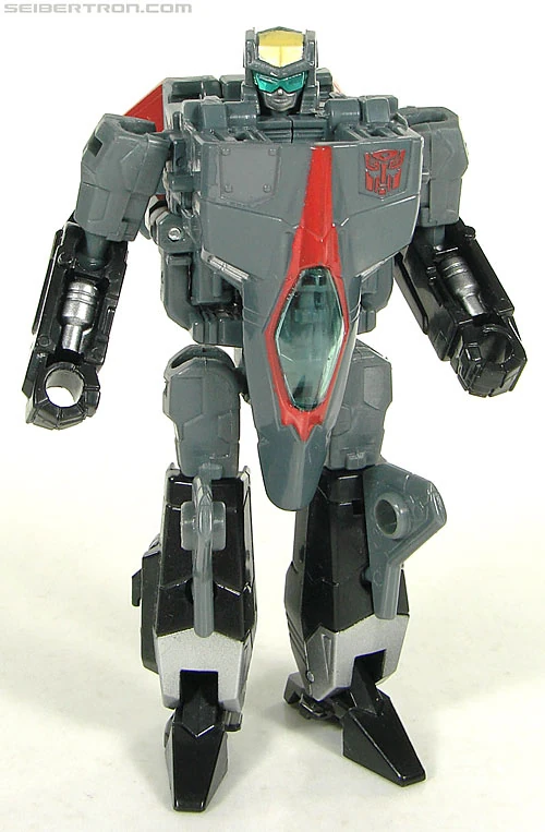 Profile: Air Raid loves surprises. He prefers to suddenly streak into a cluster of Decepticons, whether they're airborne or on the ground, over shooting at them from long range. "That always sparks their wires a bit," he laughs. Of all the Aerialbots, his tactics are the most fearless, although some might call them rash and foolish. No matter- his gung-ho, wild-eyed personality legitimizes either viewpoint. At the core of his actions is one goal that drives him above all else- he wants to have fun! And no matter what he's involved in, he achieves that goal- even in the middle of a war.