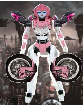 Arcee is a female Autobot. She is capable of throwing boomerangs as weapons and transforms into a pink and white motorcycle.
