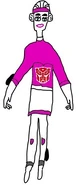 Arcee has white and pink armour. She has white and pink striped helmet. She has the wheels of her vehicle mode on her left wrist and foot. She has pink stripes on each foot and hands.